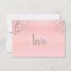 Cartão RSVP de Casamento. Apresentando um casamento moderno chamado rsvp em um fundo cor-de-rosa com pontos de confetti prateado e a palavra amor em impressão ousado. 100% personalizável. Pronto para Preencher a(s) caixa(s) ou Clique no botão PERSONALIZAR para adicionar, mover, excluir, redimensionar ou alterar qualquer fonte ou gráfico. Feito com vetor de alta resolução e/ou gráficos digitais para um impressão profissional. NOTA: (ISTO É UM IMPRESSÃO. Todos os designs do produto zazzle são "impressões", a menos que indicado em "Sobre este produto"). O design será impresso EXATAMENTE como se o visse no ecrã e no produto...portanto, certifique-se de que, ao fazer suas alterações no redimensionamento de qualquer dos gráficos ou textos que ele ajustado nas áreas corretamente, e que sua ortografia e texto seja como você gosta que seja em tamanho, cor e fonte. Obrigado pelo apoio e parada na minha loja - LetsUDesignIt