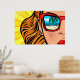 Uma legal pop de arte em óculos de sol com a praia refletindo em seus óculos. Excelente com uma simples estrutura preta.