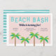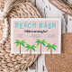 Convites de aniversário de verão bonitos para a sua pequena cabana de praia apresentam quatro ilustrações verdes de palmeiras ao longo do fundo em um fundo cor-de-rosa macio, com "basca de praia" no topo em letras retrorreflectoras. Personalize com seus detalhes de festa de aniversário usando o modelo.