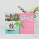 Adoráveis convites de aniversário de verão para a sua cabana de praia apresentam um fundo rosa com palmeira tropical vibrante e "é uma festa de praia!" em letras retrógradas. Personalize com seus detalhes de festa de aniversário abaixo. Adicione uma foto favorita da aniversariante para um legal toque pessoal.