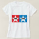 Seja seu próprio POP STAR! Camiseta com texto "pop star" em caixas de estrelas vermelhas e azuis.