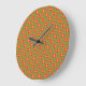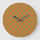 Um relógio de parede redonda, com um padrão estilizado de escarlate, rosa-claro e laranja e Bolinhas em um fundo verde. Parte da coleção 'Poppy Fields' de Posh & Painterly.