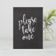 Um elegante cartaz de casamento de vanguarda, mostra o texto "Por favor, pegue um" em uma letra extrovertida, a textura do pincel adiciona um sentimento espontâneo e brincalhão. A cor de fundo pode ser personalizada de acordo com as suas necessidades e preferências, contacte-me se tiver alguma solicitação especial.