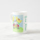 Uma linda caneca Bone China personalizável com uma joaninha lendo um livro sob duas flores amarelas. © ArianeC Ilustrações