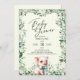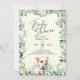 Belo convite para chás de fraldas com adorável leitão rodeado por verde-aquarela e flores. Bonito roteiro escrito à mão para o Chá de fraldas é perfeito para este doce convite neutro de gênero. Coordenando de volta. Veja a coordenação de itens no nosso compro, Encantado Finch.