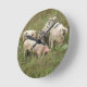 Este relógio incrível mostra uma bela fotografia de um grupo de porcos bonitos em um campo. Alguns dos porcos estão rastejando pela terra enquanto outros olham.