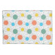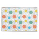 Este travesseiro tem um design moderno século médio de círculos com linhas atrás em laranja, amarelo, turquesa e verde.