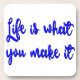 A vida é o que você faz. Um pensamento sobre a vida. Texto cursivo azul com efeito aflitivo.