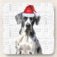 Uma porta copos quadrada com fundo branco e uma borda de cinza apresenta uma imagem de desenho animado de um Grande Dane vestindo um chapéu vermelho de Papai Noel. O fundo é coberto pela palavra "woof" repetida em vários tamanhos e estilos de fonte.