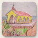Um desenho a lápis de aquarela e pintura da Capela Alto Vista em Aruba com Mar Caribe e vários cactos, rochas e arbustos espinhosos.