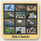 Aves da Austrália - Este design mostra algumas das aves únicas, bonito e coloridas da Austrália. Há um kookaburra, um sabiá-lirado, um ema, um cockatoo de olhos nu, pelicanos australianos, uma cockatoo com sabor enxofre, ganso do Cabo Barren, ibis brancos, galah ou "cockatoo com matiz rosa", lorikeets arco-íris, cisne negro e famoso mundo da ilha Phillip "Pequenos Pinguins"