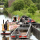 Um design fotográfico de barcos estreitos tentando andar no canal.