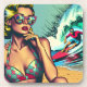 Bonito loira loira sentada na praia com óculos escuros assistindo um surfista gostoso em cores vintage em um estilo cômico de pop-art.