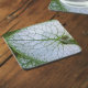 Proteja a sua mesa de marcas de água e manchas com este conjunto de 6 caldeiras brilhantes com a imagem fotográfica de uma folha de Brunnera macrofillum, verde e branca, variegada e em forma de coração. Um design floral adorável!