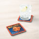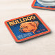 Um impressão de etiqueta de caixa de safra ilustrando um buldogue com um fundo azul padronizado e uma borda laranja. Escolha este impressão de arte no seu produto Zazzle hoje mesmo.