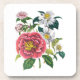 Ilustração botânica antiga de camellias em rosa, vermelho e branco.