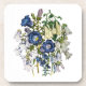 Ilustração botânica antiga de flores-belhas em azul, roxo e branco.