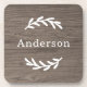 Esta elegante e personalizada montanha-russa de bebidas apresenta galhos de louros de folhas que enquadram um sobrenome da família. Um belo presente para recém-casados ou novos proprietários. Um fundo de madeira castanha de cinza curvada adiciona um olhar rústico texturizado ao design. O texto de serif branco clássico pode ser modificado via Personalizar.