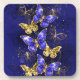 Composição de borboletas luxuosas de safira e joias de ouro sobre fundo texturizado a azul.