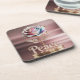 Esta porta copos apresenta uma escultura de rosa metálica com pétalas iridescentes que passam de branco para rosa para azul. A rosa tem bordas douradas detalhadas em cada pétala e se senta sobre uma haste de ouro adornada com folhas de ouro. A palavra "Paz" está em texto branco com um acabamento de ouro metálico numa base circular de ouro. Toda a escultura está sobre um fundo macio, rosa e rosa dourado. A iluminação cria uma reflexão suave sobre a base de ouro, e as superfícies metálicas do rosa têm um acabamento de alto brilho que captura a luz, criando uma aparência luxuosa e premium. A porta copos é uma porta copos de plástico duro com suporte de rolha. O conjunto de portas copos contém seis portas copos.
