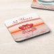 Beba coasters com meu trabalho de arte de dois corais flutuando na água sob um arco-íris. O texto personalizável diz "35 anos".