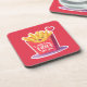 A cute and colorful cartoon illustration of a red French fries carton with a happy kawaii smiling face. The design features a floating red heart and the romantic funny pun quote "I only have FRIES for you". The image has a white sticker border, making it perfect for Valentine's Day greeting cards, fast food lovers, and humorous romantic gifts. Isolated design.