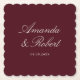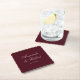 Minimalist personalized wedding coasters featuring elegant calligraphy names in burgundy and cream color design.