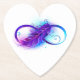 Símbolo infinito com uma bela pena pintada em cores roxas e azuis brilhantes sobre fundo branco.