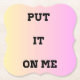 Add a cheeky twist to your table with this playful "Put It On Me" coaster! Featuring bold black text on a soft pastel gradient, this design brings personality and a touch of humor to any space. Perfect for parties, gifts, or everyday use – it’s a conversation starter and a stylish drink companion.