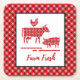 Design de porta copos de papel quadrado da fazenda apresenta silhuetas de animais fazendas (vaca, galinha, porco) com preenchimento de bandana vermelha
