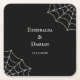 Com sotaques de teia preta esta porta copos de papel é perfeita para casamentos góticos ou eventos temáticos do Halloween. Está pronto para ser personalizado com os nomes da noiva e do noivo e sua data de casamento. O texto colorido e os gráficos são colocados em um fundo preto.