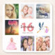 Uma porta copos de festa para uma menina da 16ª festa de aniversário, celebrando sua vida com uma colagem de 8 fotos suas. Modelos para um nome, 16 anos e uma data. Data de nascimento ou data da festa. Coral e letras coloridas burladas. Fundo branco.