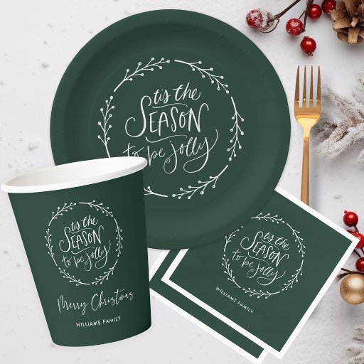Adicione um toque festivo neste feriado, sirva seus hóspedes em estilo com nossas portas copos temidas de Natal. Design apresenta a frase ' é a estação a ser alegre' em um script branco, com letra de mão, rodeado por uma coroa branca de morango em um fundo verde.