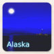 Moonrise na passagem de Dentro do casaco do Alasca. Montanhas à distância e um barco de pesca dirige-se para norte. A leitura de texto "Alaska" aparece em azul e branco brilhantes.