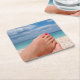 Porta copos com pés das mulheres com verniz para as unhas rosa vermelha em uma praia branca em uma ilha no mar Mediterrâneo que relaxa durante as férias de verão.