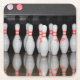 Uma porta copos de bebida com uma foto de um rack de pinos de boliche.