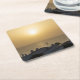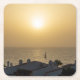 Vista do complexo de bangalôs para o mar com um barco à vela ao pôr do sol, em Costa Adeje, Espanha, Tenerife