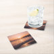 Foto impressionante de um pôr do sol sobre uma praia deserta com montanhas e palmeiras à distância.