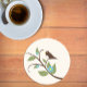 Bird birthday collection featuring a brown bird on a tree branch amidst leaves and bright blue flowers