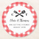 O toque perfeito para uma festa de noivado de I Do Do CHURRASCO ou janto de ensaio desta porta copos de bebida tem o monograma do casal entre ferramentas de grelhamento em um padrão alegre de cobertor de piquenique vermelho com fácil personalização do texto.