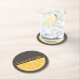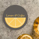 Uma porta copos marrom com meia fatia de limão amarelo e texto personalizável. Pode ser usado quando você recebeu amigos ou familiares em casa ou em um bar!