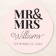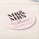 Sr. Elegante, Festa de noivado de ensaio clássico, Porta copos de papel redondo. Personalize a modelo com seu sobrenome e data do seu casamento, noivado ou aniversário. Perfeito para o janto de ensaio, festa de noivado ou recepção de casamento. Apresenta opções cor-de-rosa, preto, branco, ouro e castanho.