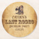 Convocando todos os caubóis para celebrar o Último Rodeio do seu amigo sulista. Um par marrom de botas de caubói e chapéu estão em cima de um porta-copos de papel de festa estilo pergaminho marrom desgastado grunge para um momento divertido com seus amigos country western. Uma festa de solteiro temática do velho oeste legal.