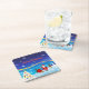 Linda paisagem de neve com uma árvore de Natal, flocos de neve, e um arco-íris sobre o céu. Papai Noel está acenando e duas renas estão juntas para distribuir presentes de Natal.