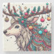 Esta ilustração vibrante mostra uma rena adornada com intrincadas decorações de Natal. Suas galhadas se transformam em uma tela festiva, enfeitada com sagrado, bagas, ornamentos e estrelas cintilantes. A cabeça das renas é decorada com padrões e miçangas coloridas, capturando a alegria e a magia da época de férias.