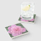 Uma porta copos de bebida com uma foto de uma peônia rosa.