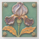 Art Nouveau azulejo cerâmico com flor da íris com pétalas roxas e folhas amarelas sobre fundo verde, cercado por quatro pequenas flores amarelas nos cantos, estilo vintage.
