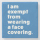 Muitas pessoas estão vestindo máscaras faciais e outros revestimentos para se proteger da COVID-19 e infecções semelhantes; em algumas partes do mundo, há um requisito legal para vestir em certas áreas. No entanto, nem todos podem vestir uma máscara. Algumas pessoas estão isentas por razões de saúde ou outras. Muitas vezes, as crianças beneficiam de isenções. Pessoas com asma, dificuldades respiratórias, ansiedade e muitas outras doenças são também aconselhadas a não vestir máscaras faciais. Esta design pretende tornar isto claro para todos à vossa volta. O texto diz claramente "estou isento de vestir uma cobertura de rosto".