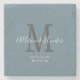 Mantenha-se perfeito com esta Porta copos de Pedra Azul Dusty, criada por recém-casados modernos. É um design moderno personalizável em cinzas azuis, brancas e leves empoeiradas. Os primeiros nomes de noiva e noivo estão no centro em letras modernas de escrita manual branca e o início do novo sobrenome está na cinza. A data estabelecida é na parte inferior e o texto é "nós dissemos que sim." Personalize qualquer texto ou exclua se desejar.