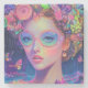 Um incrível retrato surreal de fantasia de uma mulher radiante adornada com óculos pastéis brilhantes e uma coroa de flores e frutas neonatais. Composta a uma paisagem de sonho floral cósmica com borboletas flutuantes, este trabalho de arte digital explode com cor, magia e energia feminina.